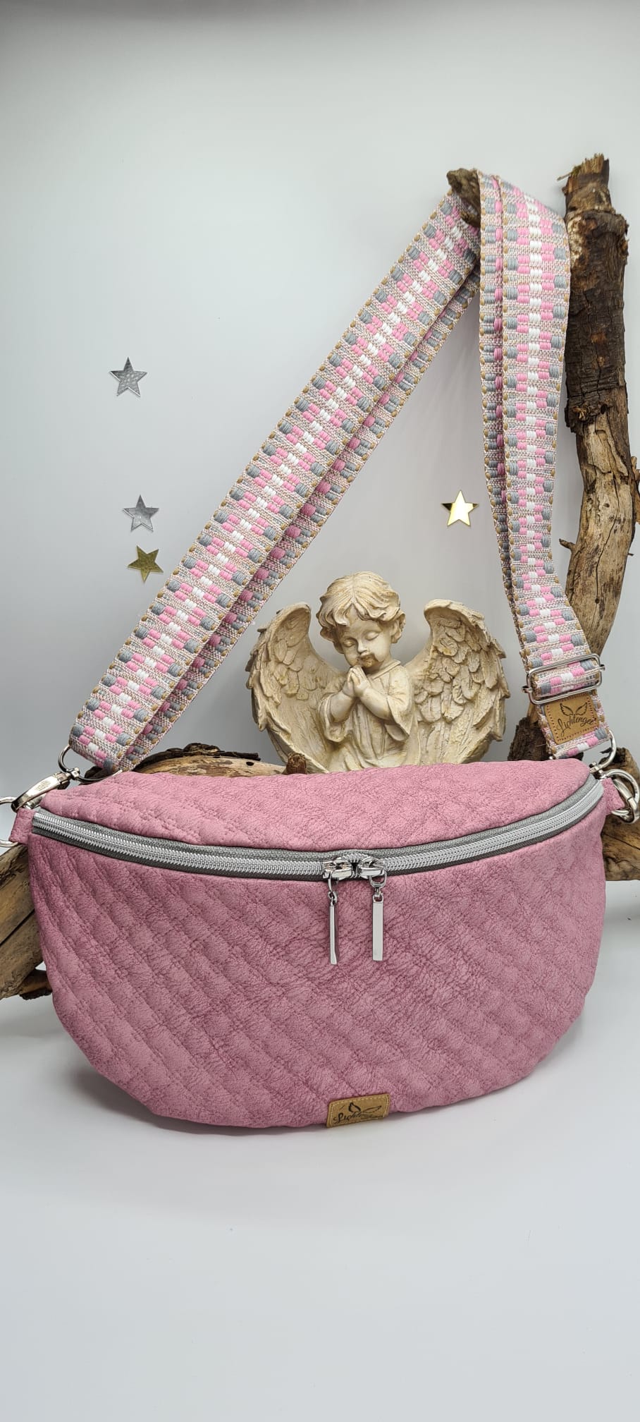 20 Produktbeschreibung Kunstleder geprägt rosa, Reißverschluss silber, Schlüsselfinder, Innenfach geteilt, Gurt grau/rosa gemustert wechselbar Anfragen