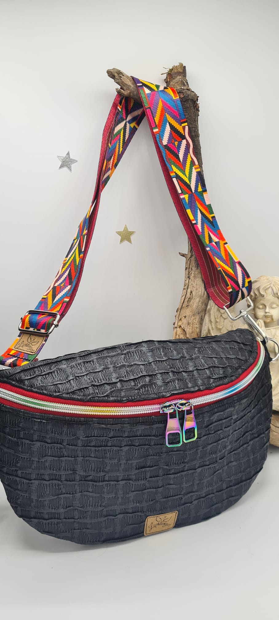 37 Produktbeschreibung CrashstoffInnenfach geteiltReißverschluss RegenbogenSchlüsselfinderGurt bunt wechselbar