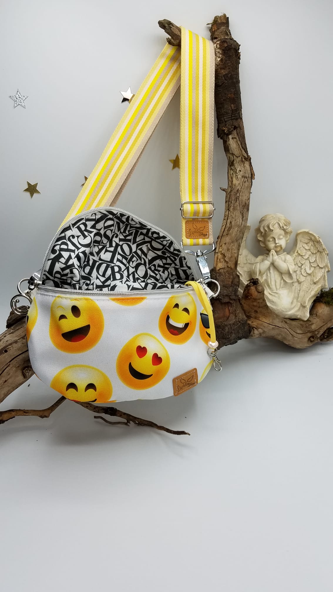 Smiley Produktbeschreibung CanvasstoffbedrucktSchlüsselfinderInnenfach geteiltRV SilberGurt gelb wechselbar
